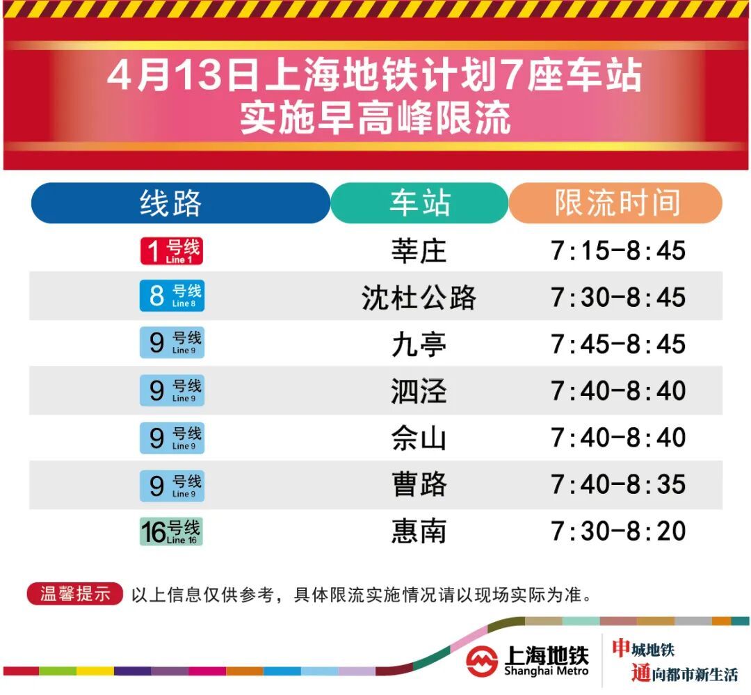 4月13日早高峰九亭、惠南等7座地铁站计划限流