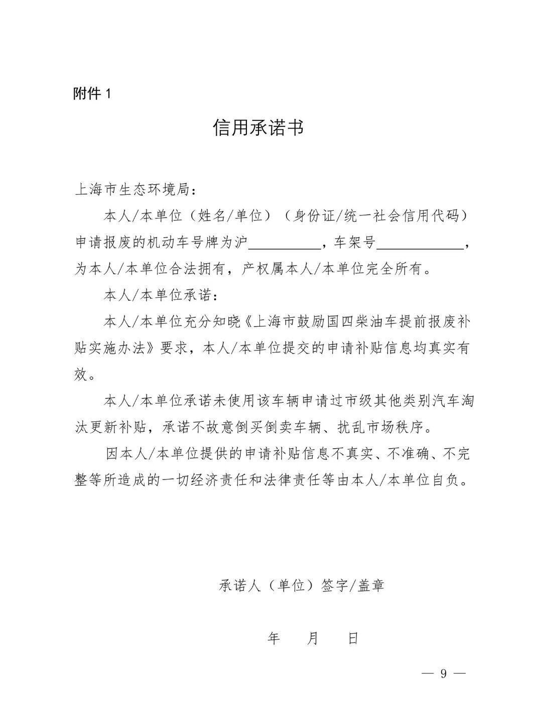 符合补贴申请条件的车辆所有人可通过“一网通办”、“上海环境”微信公众号等平台申请补贴,应提交报废车辆车架号和本市登记的号牌号码;车辆所有人姓名/单位名称、身份证号码/统一社会信用代码;与车辆登记户名一致的银行账号信息;车辆所有人《信用承诺书》(附件1);车辆所有人委托他人办理申请的,还应提交全权委托书(附件2)、全权代理人身份证。