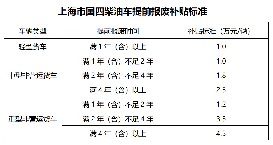 对已办理报废手续且提前报废时间满一年及以上的轻型货车、中型非营运货车、重型非营运货车等3类国四柴油车的车辆所有人,给予提前报废补贴。