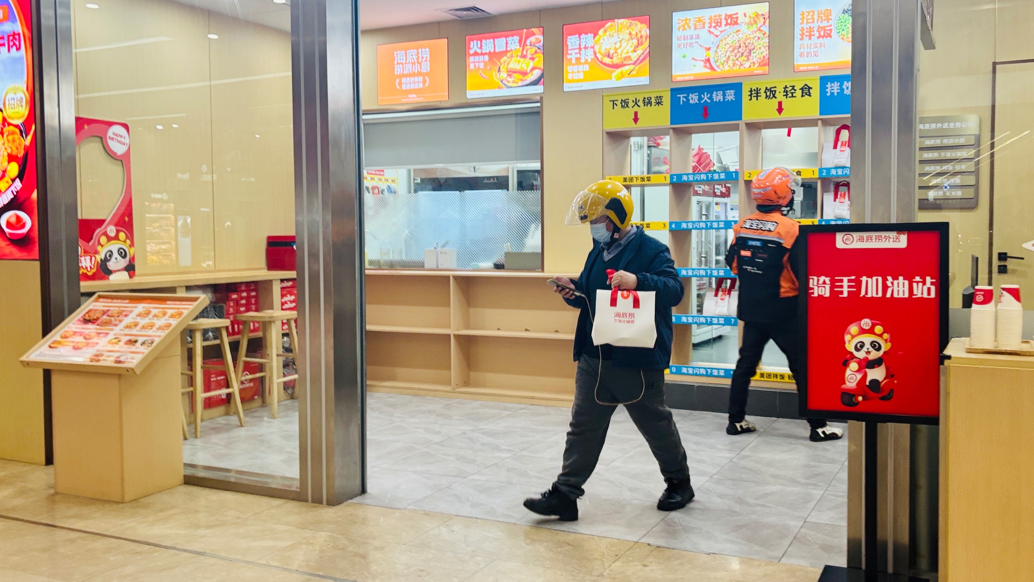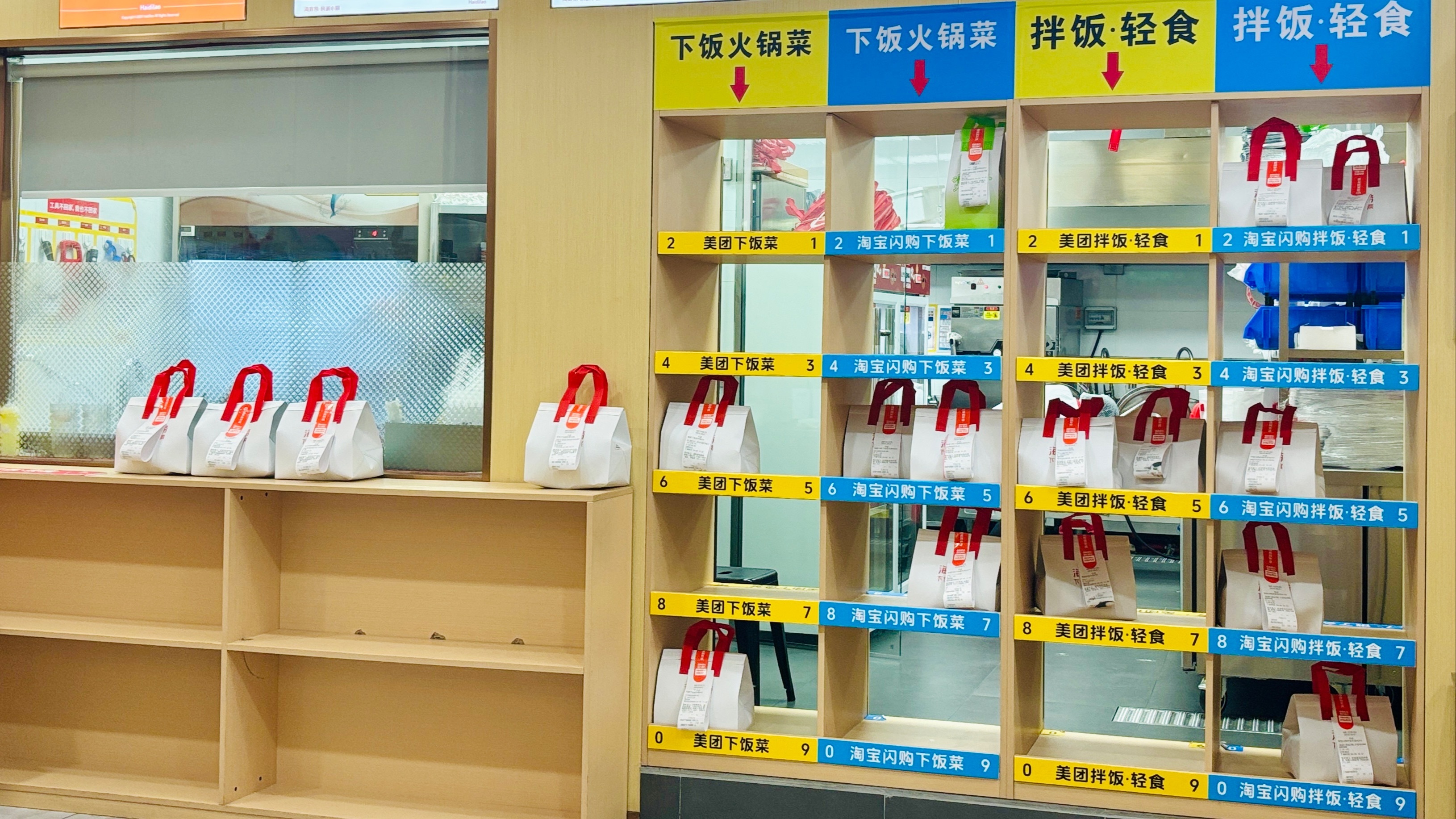 4月9日上午11时,松江区东鼎商业广场海底捞的外卖取餐区秩序井然。取餐柜上,“下饭火锅菜”“拌饭·轻食”等分类标牌清晰可辨,美团、饿了么等不同平台的订单各有归位。美团骑手蒋林安扫了一眼手机,径直走向对应格口,不到两分钟便拎着餐袋走出商场。