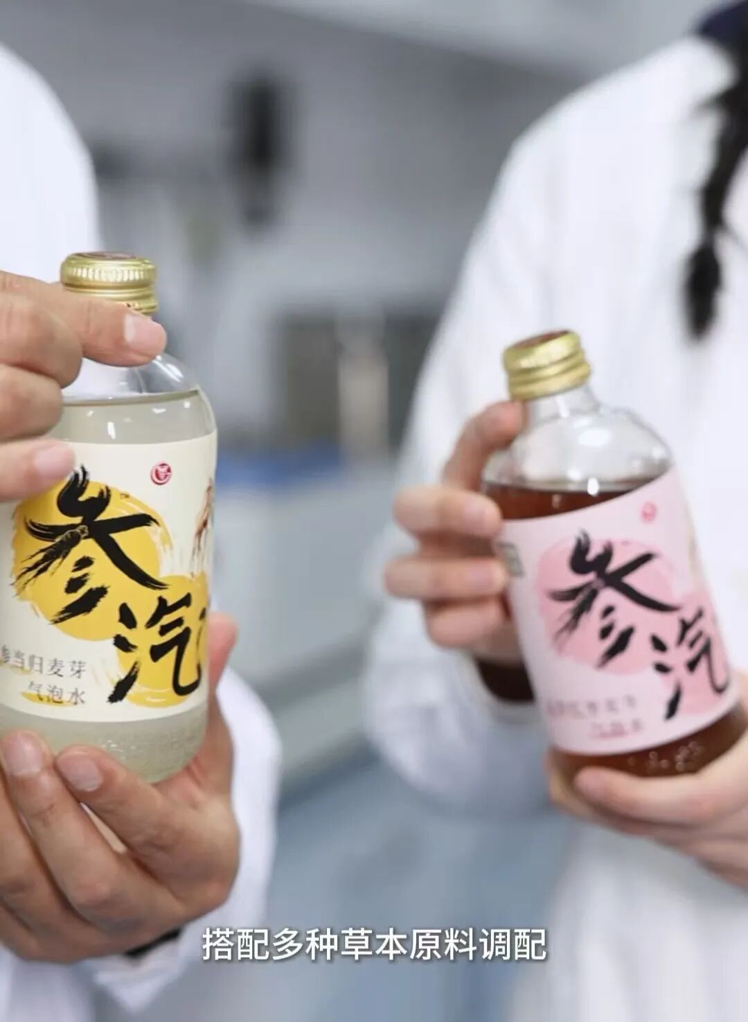 今年新出的参汽双参气泡水,就是一次大胆的尝试。人参+丹参,配上多种草本,喝起来是自然的甘甜和绵密气泡,没有那种“中药味”。