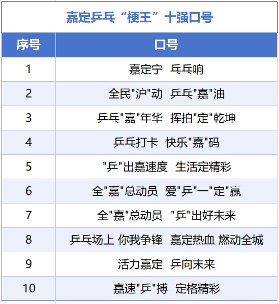 从“嘉定宁,乓乓响”的直白自豪,到“全民‘沪’动,乒乓‘嘉’油”的巧妙谐音,再到“乒乓‘嘉’年华,挥拍‘定’乾坤”的磅礴气势——