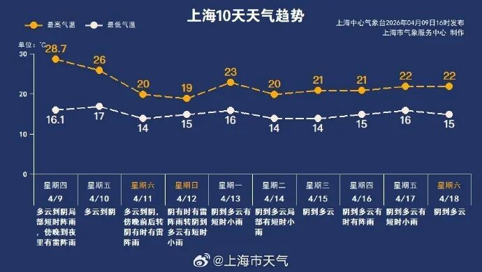 本周双休日气温有所回落,最高气温在19~20℃。周六白天天空状况依旧不错,傍晚起逐渐转雨,主要降水时段会从周六晚上持续到周日白天。下周西南暖湿气流活跃,上海多降水过程。气温相对平稳,最高气温在20~23℃之间,最低气温在14~16℃之间波动。春季天气多变,提醒大家关注临近预报,了解最新的预报预警信息。