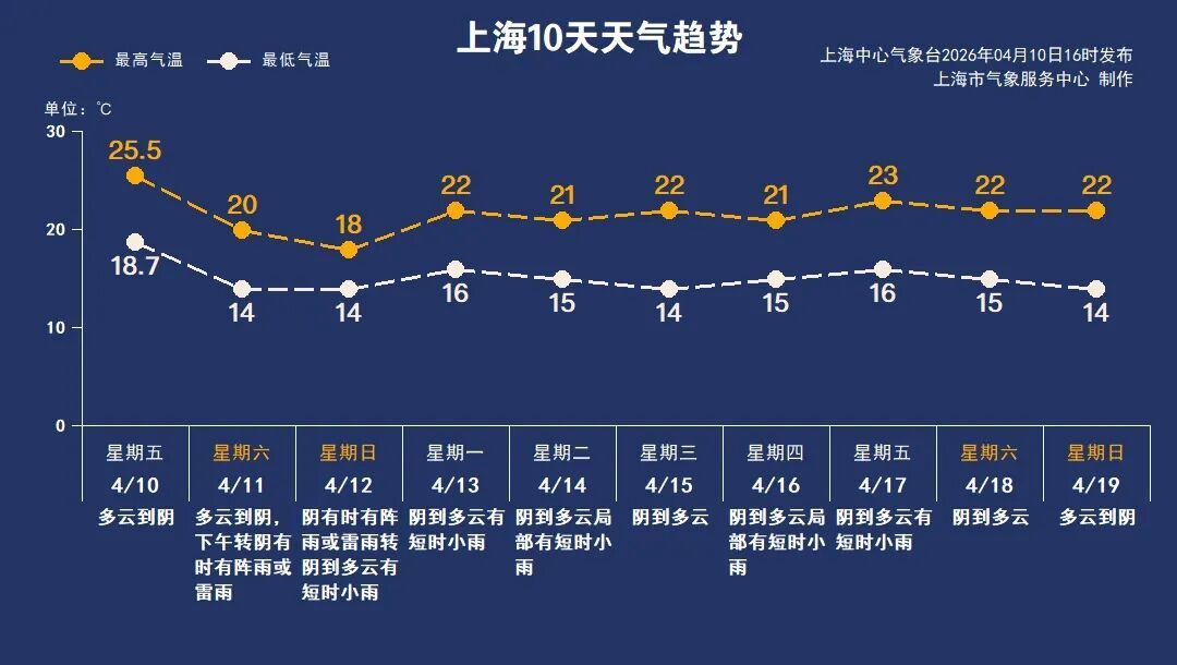 春雨绵绵无绝期 接下来雨日很多! 具体来看 申城天气今天白天多云到阴为主 午后阳光上线 全市最高气温较昨天略有回落 在22~27℃ 白天湿度大 体感并不舒适 受低涡切变北抬东移影响 周六下午到周日阴有时有阵雨或雷雨 同时风力增大 雨水影响下 气温下降 具体预报 ↓↓↓ 多云到阴 下午到傍晚转阴有时有阵雨或雷雨 东南风4~5级 沿江沿海地区阵风6级 相对湿度95%~55% 气温14~20℃ 白天阴有时有阵雨或雷雨 夜里起雨势减弱 转阴到多云有短时小雨 偏东风4~5级阵风6级转偏北风3~4级 气温在14~18℃ 下周申城仍多降雨天气过程 不同于这周的雷阵雨天气 下周的雨以短时小雨为主 其中周三和双休日雨水暂歇 是阴或多云的天气 气温比较平稳 最低14~16℃ 最高21~23℃ 短暂的初夏体验后 又回归春天 4月12日(周日):阴有时有阵雨或雷雨转阴到多云有短时小雨,14~18℃ 4月13日(周一):阴到多云有短时小雨,16~22℃ 4月14日(周二):阴到多云局部有短时小雨,15~21℃ 4月15日(周三):阴到多云,14~22℃