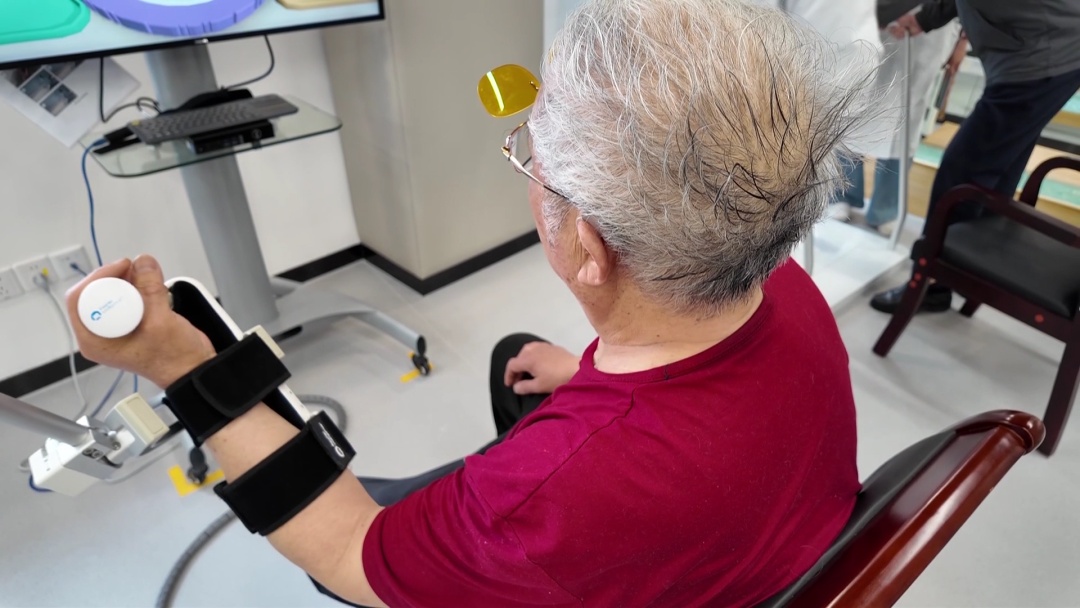 走进康复中心,70多岁的余老伯正在认真地进行康复训练。余老伯年轻时是一名排球运动员,身形高大,可患上帕金森病后,身体行动变得极为不便。如今,他正借助平衡评估训练系统,通过控制自身平衡在屏幕上完成切水果的操作;还利用上肢训练机器人,以“钓鱼”的方式锻炼上肢和肩膀的活动度与灵活性。经过一段时间的训练,余老伯的变化十分显著。他感慨地说:“以前,我睡在床上动弹不得,坐起来也很困难。现在完全不一样了,翻身、坐起都能自己控制。走路也稳多了,以前走路跌跌撞撞,现在步伐稳健。这都多亏了张医生帮我进行腿部锻炼。自己在家训练缺乏系统性,在这康复中心经过医生两个月的专业指导,我明显感觉到自己变化很大。现在我主动按时到医生那里接受训练,家门口有这样的条件,简直和私人康复中心一样方便。”