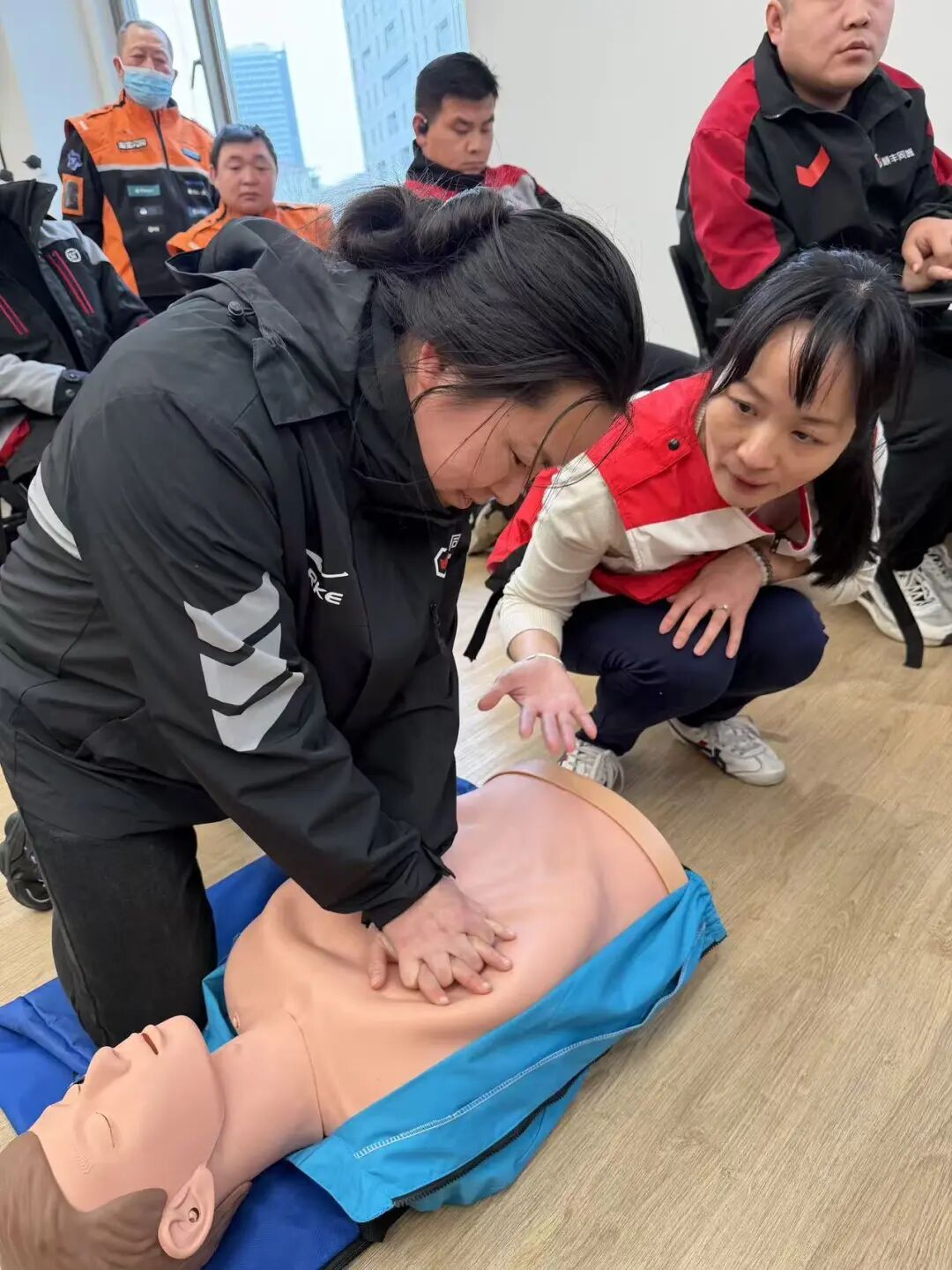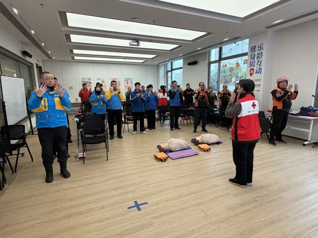 此次培训由龙华街道联合徐汇区委社会工作部、区红十字会共同开展,致力于提升新就业群体在突发情况下的“自救、互救、他救”能力。红十字会专业讲师以“实用、易懂、可操作”为核心,重点围绕心肺复苏关键技能进行手把手教学。现场实操环节,老师一对一纠正动作,力求每一个动作标准、到位。