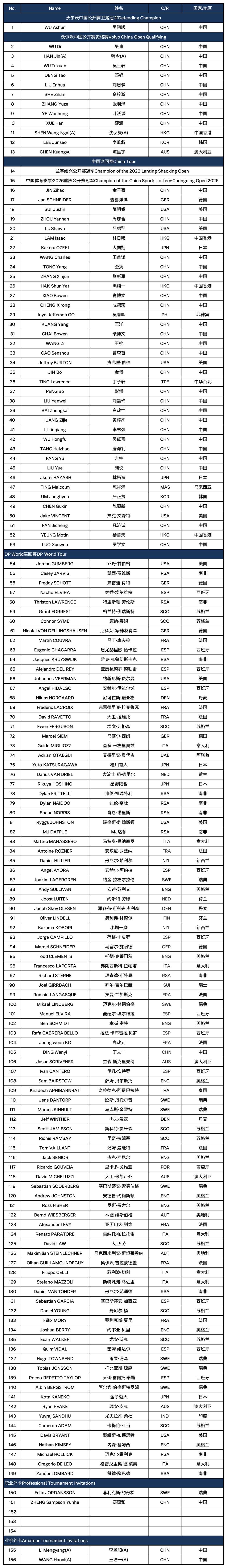 2026年沃尔沃中国公开赛球员名单