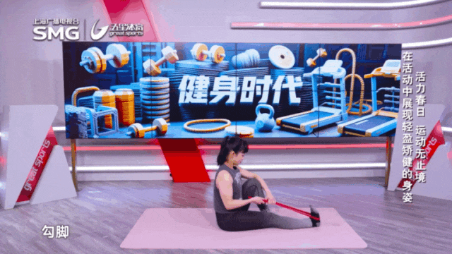 动作要点:坐在地面上,先从直腿勾脚尖开始,绷直脚背,勾脚尖。然后将弹力带套在一侧脚的脚掌前部,双手握住带子两端提供阻力。缓慢进行脚尖“勾起”与“踩下”的动作。