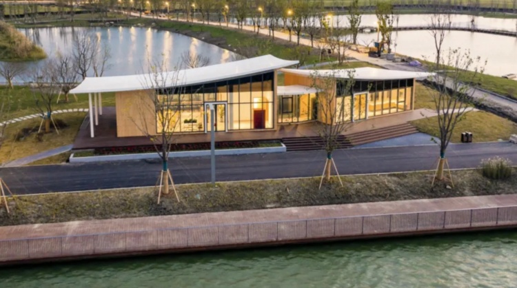 被湖水环绕的驿站,设计感十足,有大片草坪,是拍摄“高铁穿湖”的绝佳机位。