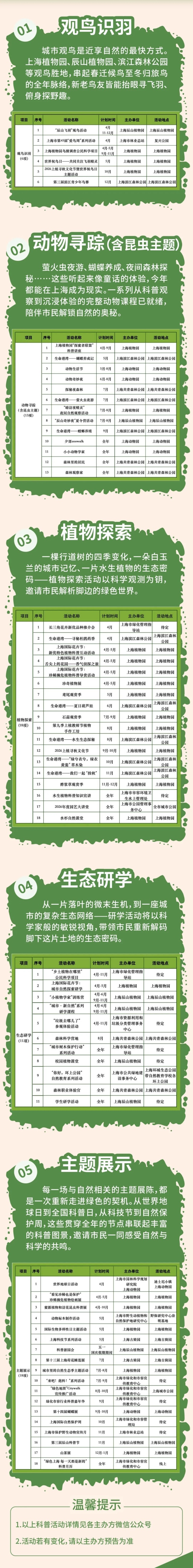 市绿化市容局介绍,在市相关主管部门指导、多方协同联动下,2026年上海市绿化和市容管理局自然科普品牌「申入自然」匠心策划推出五大板块66项科普活动,全力构建“月月有活动、季季有亮点、全年有惊喜”的自然科普新图景。其中,“观鸟识羽”系列活动6项、“动物寻踪”系列活动13项、“植物探索”系列活动18项、“生态研学”系列活动11项、“主题展示”系列活动18项,融合市民科学、夜间观察、园艺手作、研学营地、主题节日等多元形式,构建起覆盖全年龄段、贯通全场景的自然科普矩阵,让城市自然触手可及↓