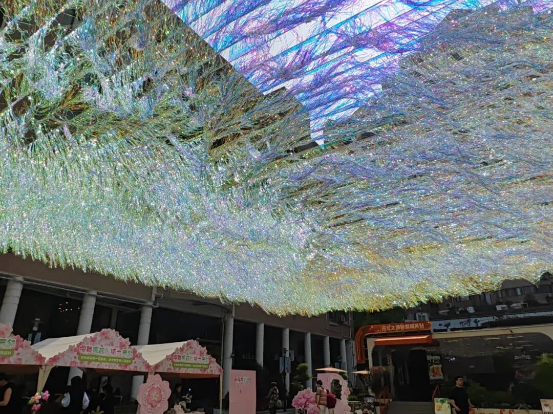 这片遮阳幕布藏着十足巧思。万千镭射丝带纵横交织,织就一方轻盈灵动的天幕,远远望去,丝带在春风中随性摇曳,如海浪般此起彼伏、舒展自在,风过处,光影流转间尽显灵动之态。