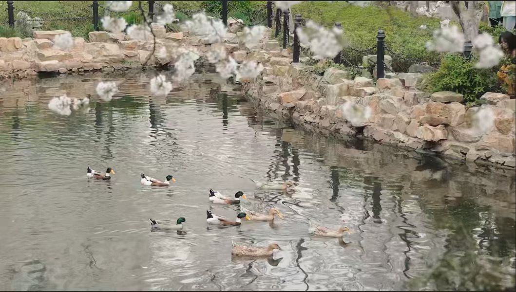 北大山瀑布旁的落樱池更是绝了,花瓣飘落在水面,随波荡漾成一层柔软的粉。