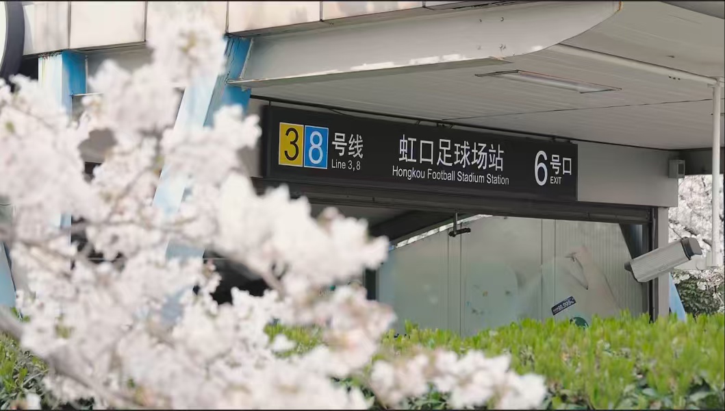 地铁3/8号线虹口足球场站一出,粉色暴击瞬间拉满,地铁站6号口旁的樱花树,随手一拍都是氛围感人像。