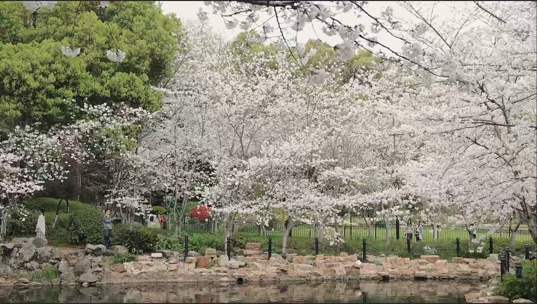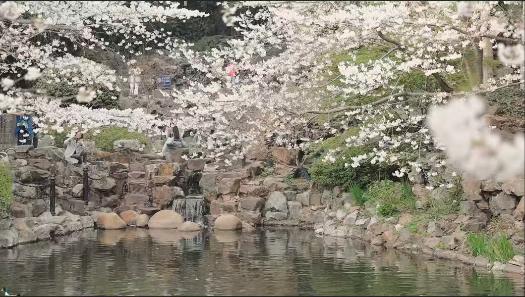 作为上海老牌赏樱地,这里的樱花藏着不一样的雅致,假山、池塘、石拱桥被粉樱温柔环抱。