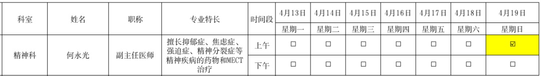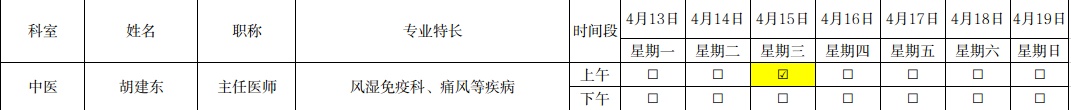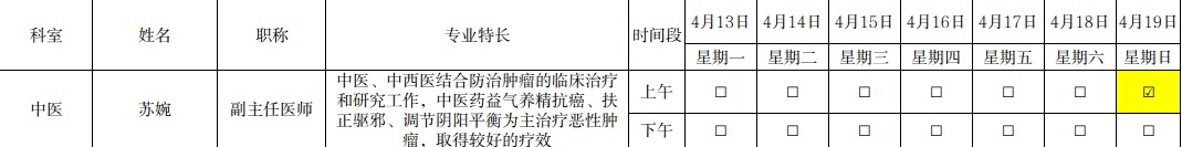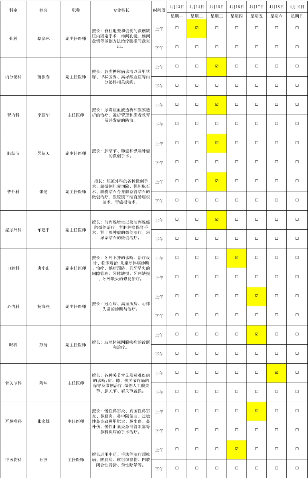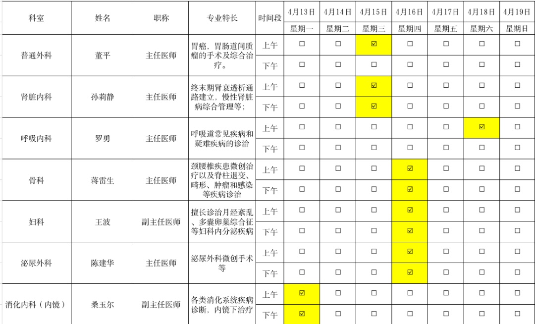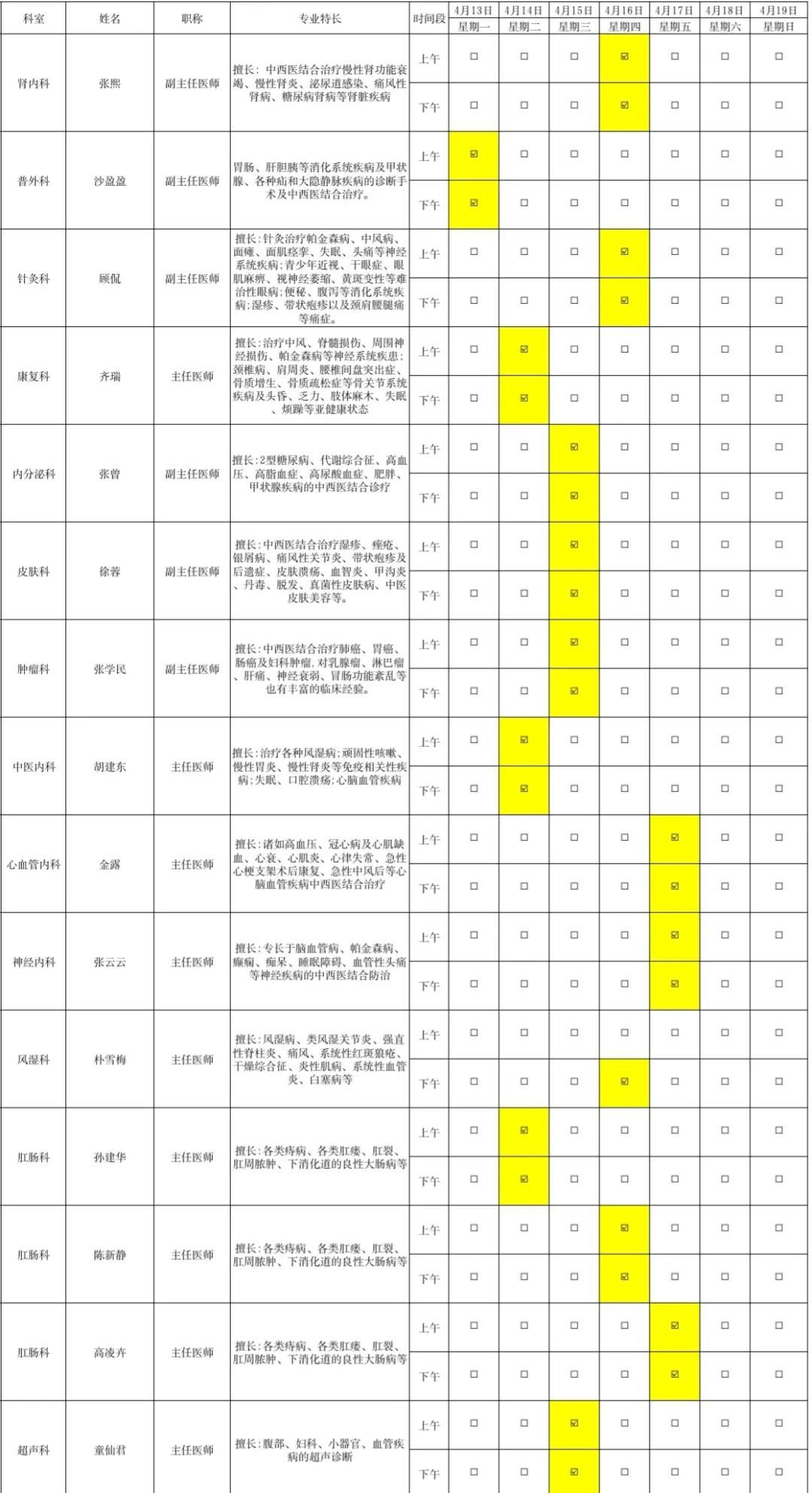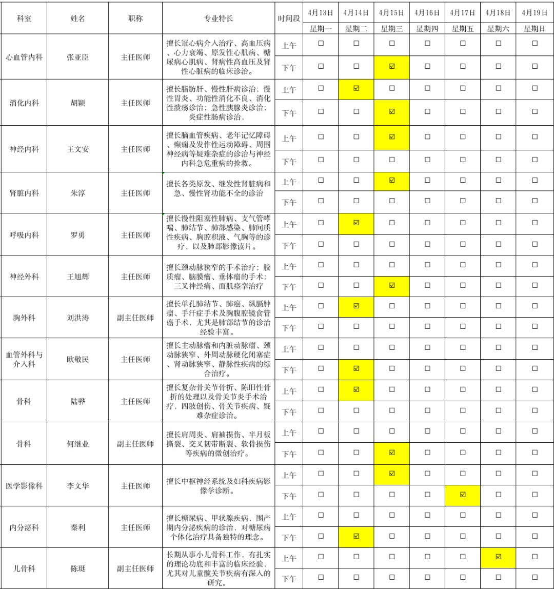 以下为2026年4月13日-4月19日市区医院下沉专家坐诊信息一览表,供广大市民参考。