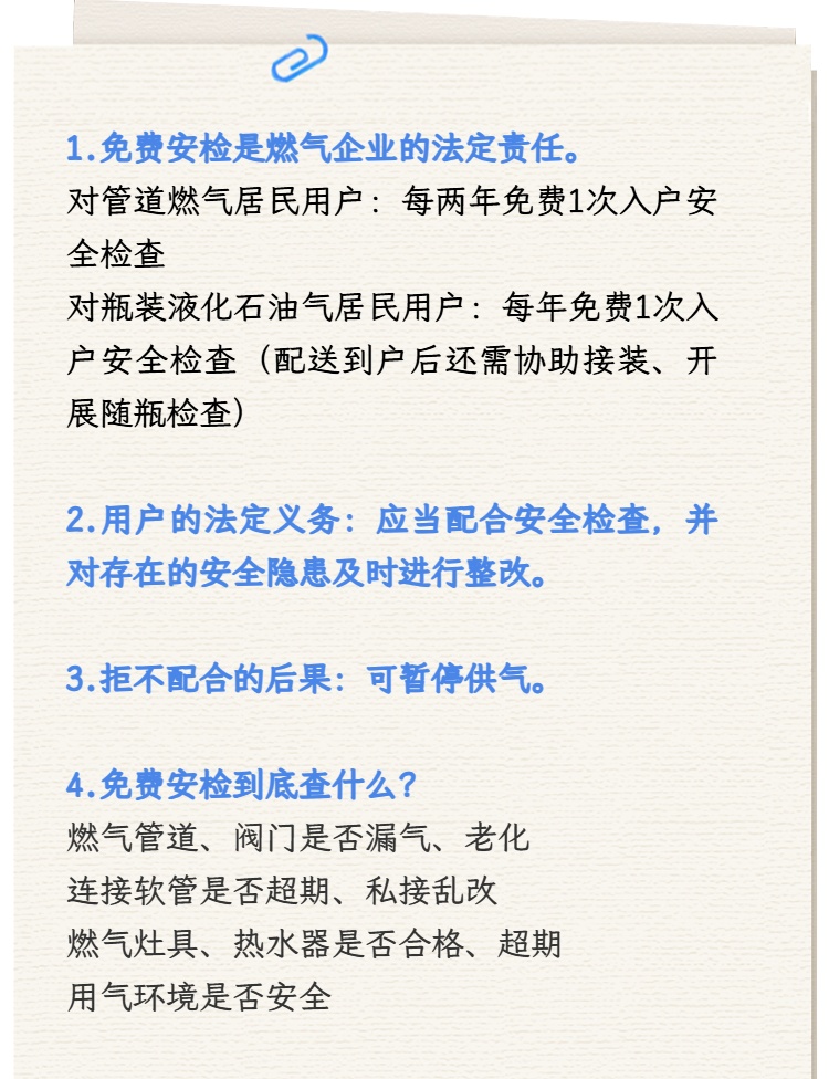 《上海市燃气条例》于今年2月25日起已正式实施,为了让市民读懂用好新规,市住建委聚焦大家最关心的免费入户安全检查。燃气安检不是可选项,是燃气企业的法定义务;配合安检、整改隐患,更是每个用户的法定义务。今天就带大家一图看懂:免费安检查什么、不配合有什么后果、怎么辨别正规安检人员,守住居家用气安全第一道防线!