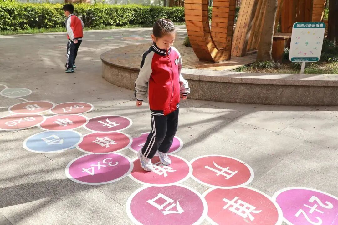 课间时分,学生们在自主设计的“地面彩绘游戏区”奔跑跳跃