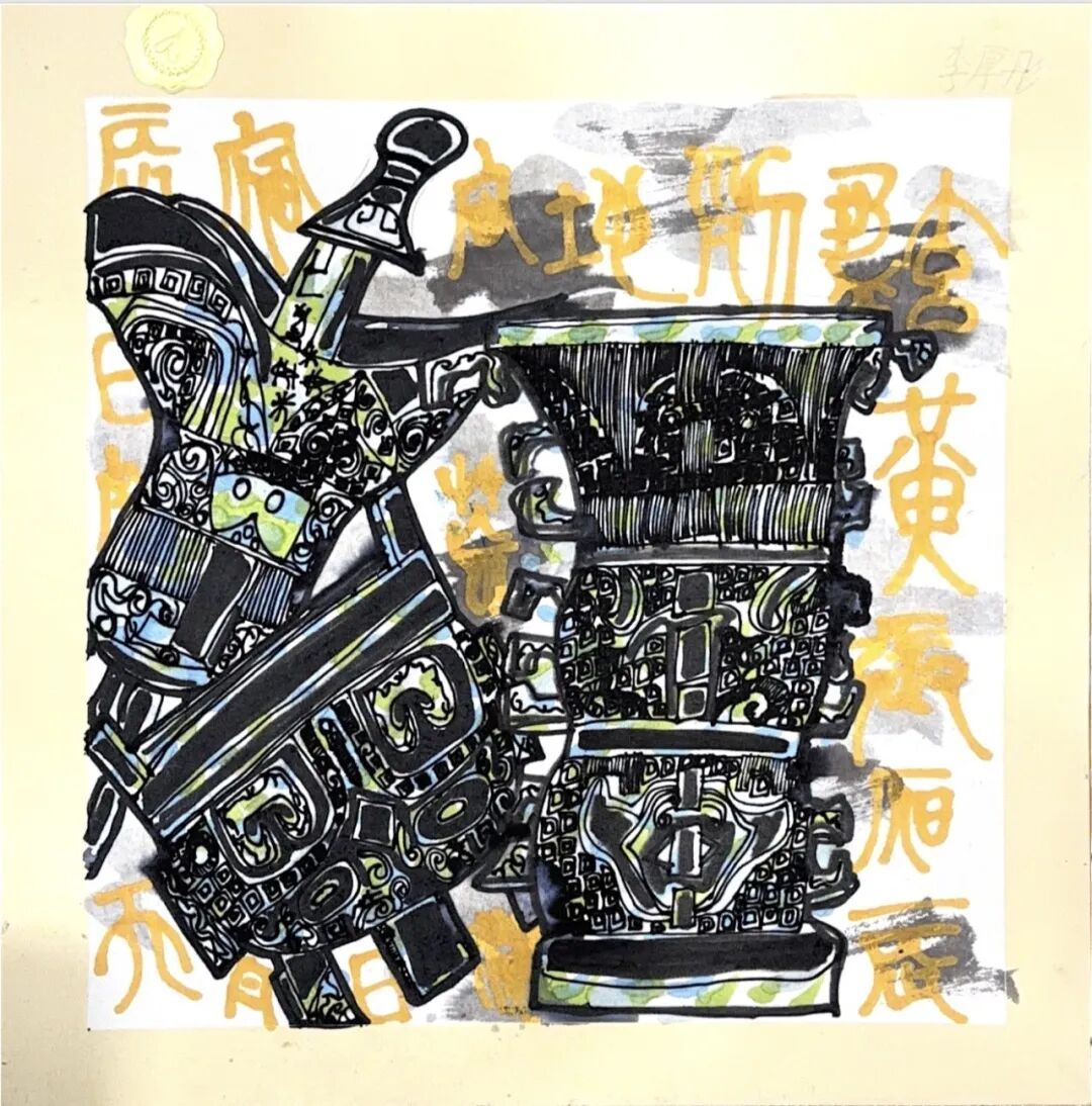 简介:这幅画作者画的是博物馆里的几件青铜器,它们身上刻着弯弯绕绕的花纹,像藏着古老的秘密。黑线条和金色的文字让它们看起来沉甸甸的,好像在诉说几千年前的故事。作者想把这些带着历史温度的青铜器,永远留在画里。