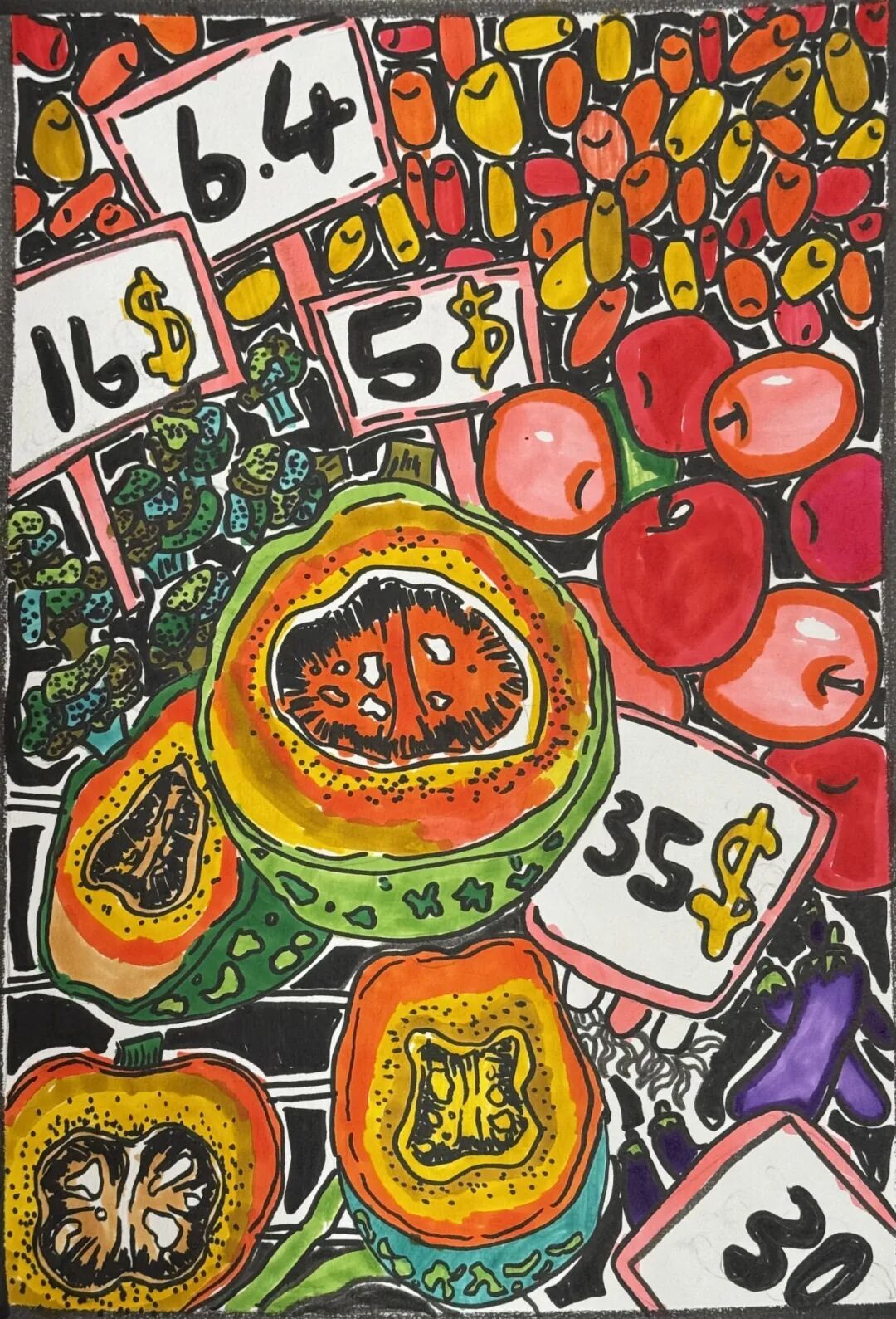 简介:这幅画以粗黑线条勾勒蔬果,色彩浓烈鲜艳:切开的木瓜、南瓜、苹果与西蓝花、茄子等堆叠,搭配标有价格的价签,充满市井烟火气,用明快撞色与童趣笔触,呈现热闹鲜活的市集氛围。