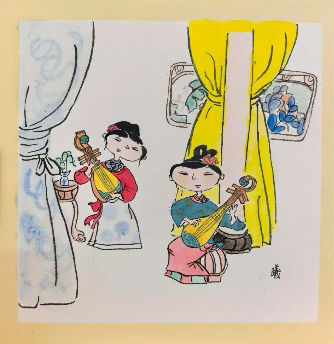 简介:这幅画以明快的水墨线条与清雅设色,勾勒出两位古装女子抚弦弹乐的雅致场景。作品以童趣化的造型语言赋予古典题材新的生命力,传递出东方美学里悠然自得的生活诗意。