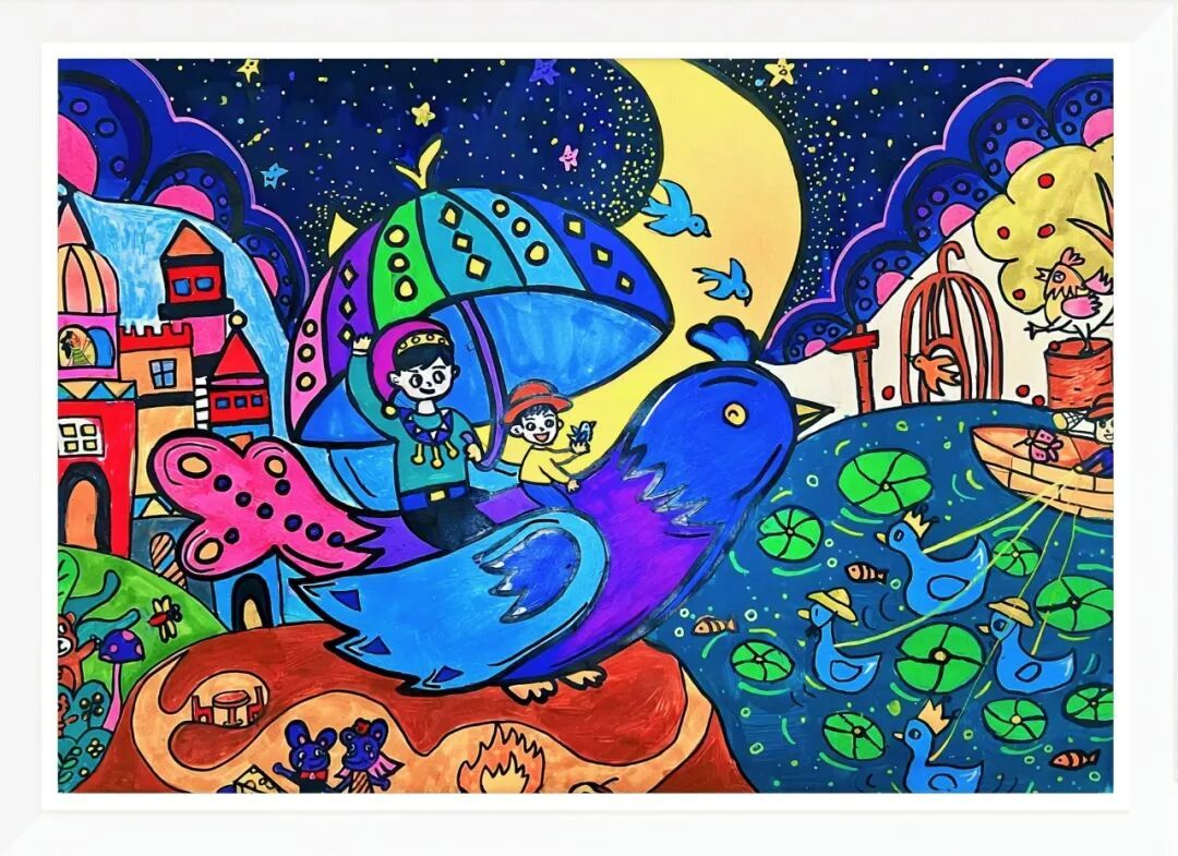 简介:这幅画以作者的梦为基础,画出了梦里有一只蓝色的青鸟,载着作者和月亮神,撑着彩虹伞在星空里飞。水里的小鸭子、岸边的城堡和小动物都来凑热闹,作者用好多鲜艳的颜色,画出这个热闹又神奇的梦。