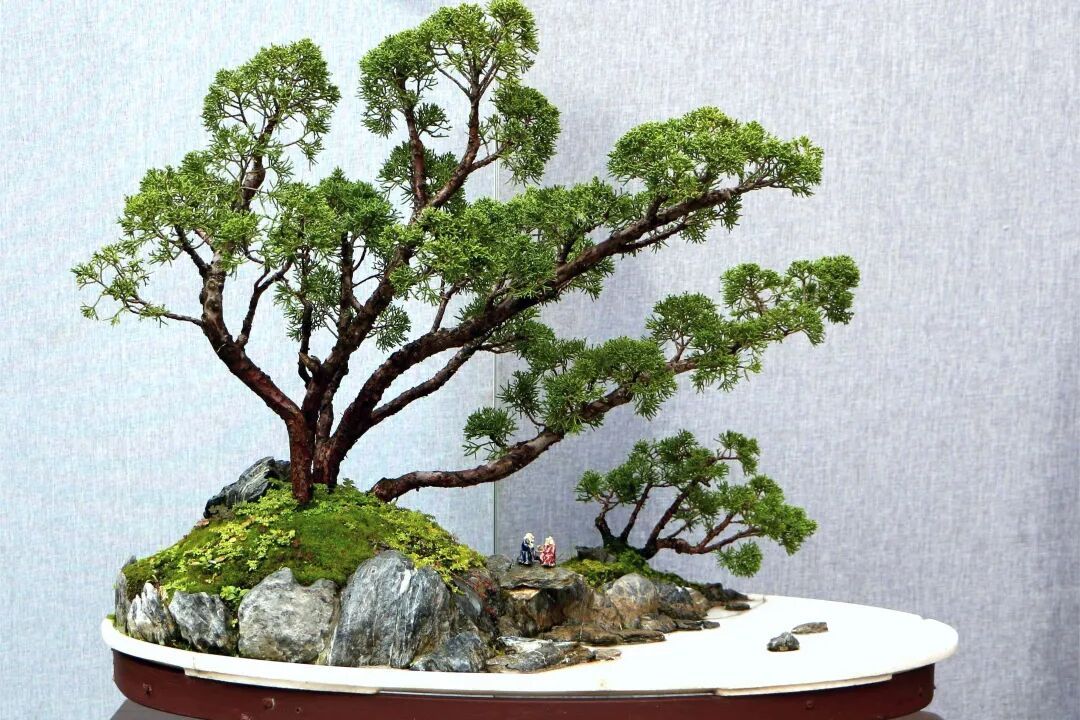 还需经过几年甚至十几年培养取舍修剪,造型才能趋于完美,再配以观赏盆,点缀石头及摆件,配置几架,一件成熟的盆景作品才算完成。完成还不是终点,此后还需长年精心养护,让它在岁月中慢慢养出更深远的意境。