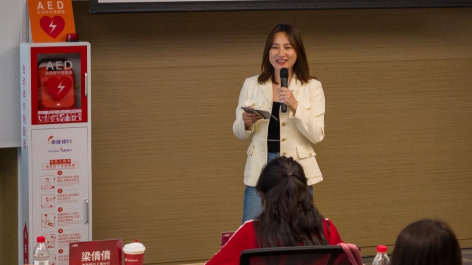 活动中,民建会员、泰隆银行上海分行小企业部总经理梁倩倩介绍“守护科创之心”公益项目。该项目由泰隆银行上海分行与上海第一财经公益基金会共同发起,旨在通过AED设备捐赠、急救培训及常态化维护机制,提升科创人群的应急救护能力,完善面向科创人才的公共安全保障。
