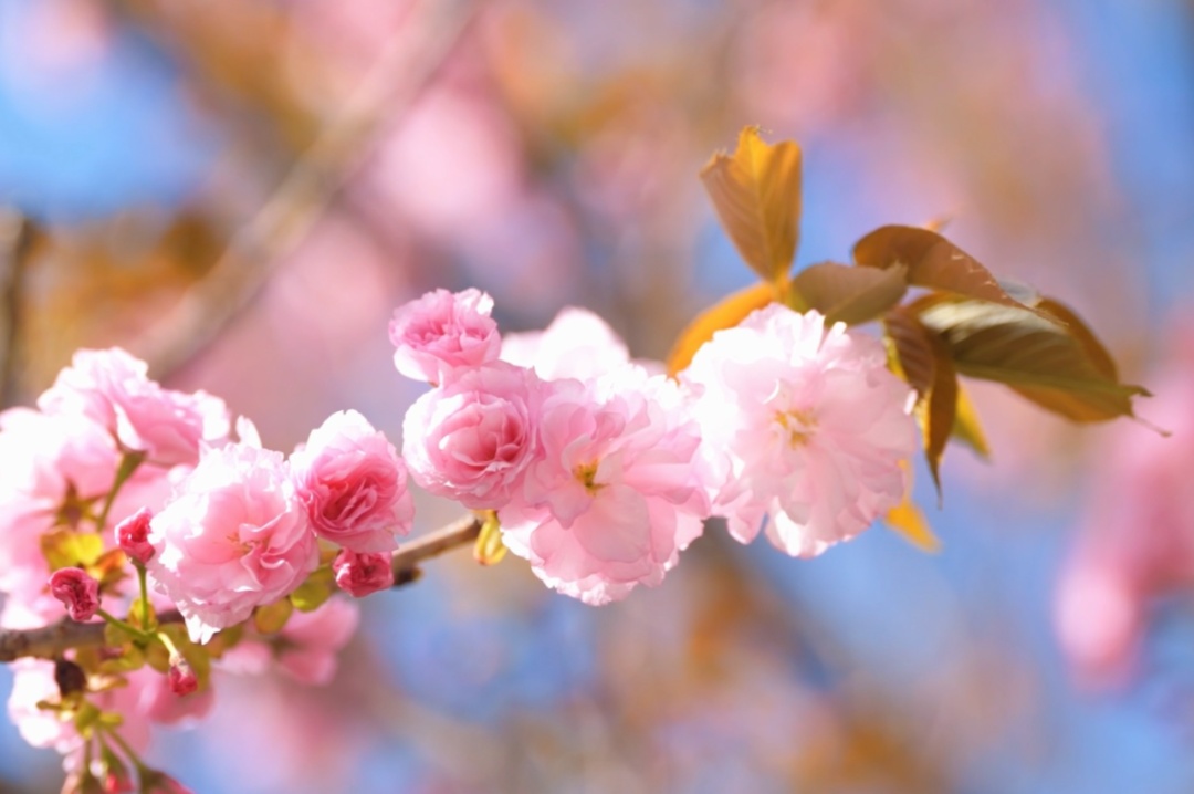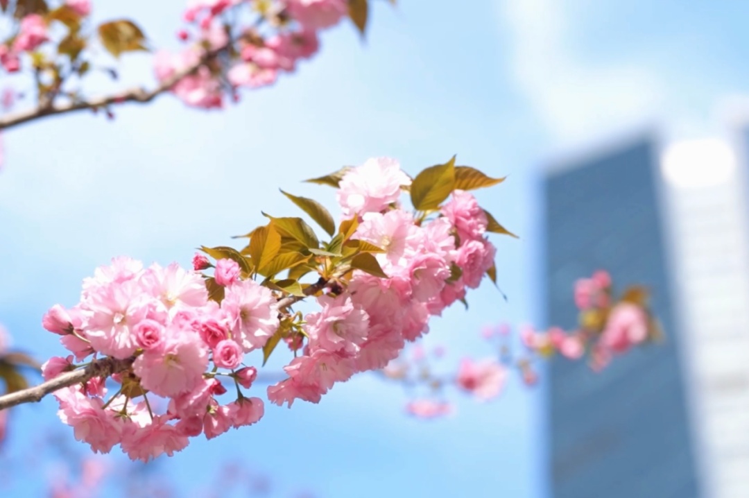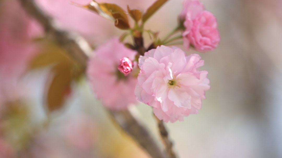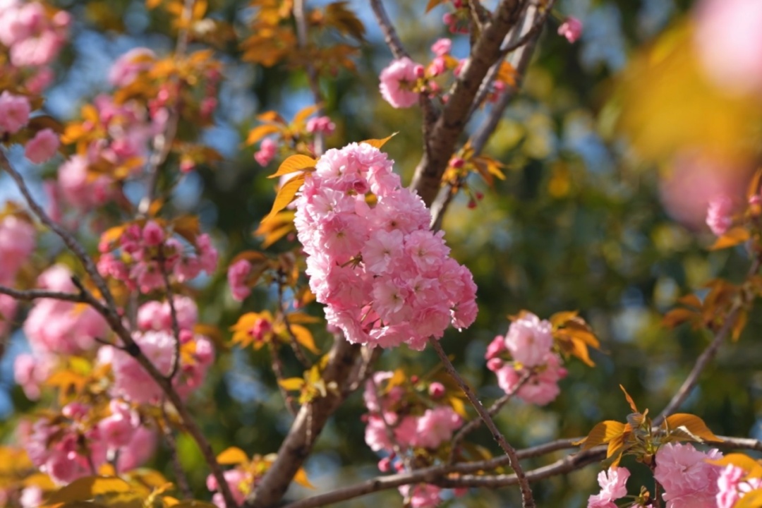 不同于染井吉野樱的轻盈,晚樱以重瓣的丰腴姿态悠然绽放。花瓣繁复如重瓣蔷薇,色泽明丽。