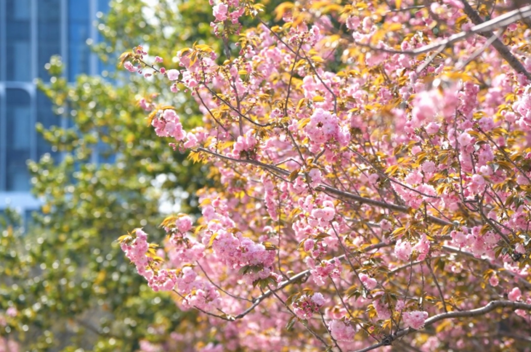 走进花园,只见晚樱树姿舒展优雅,枝条斜逸,花开满树。层层叠叠的粉色花瓣簇拥枝头,为城市街头增添了一抹浪漫。