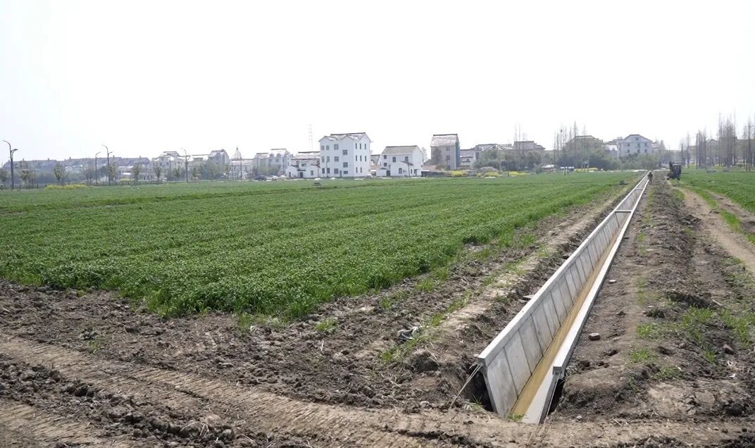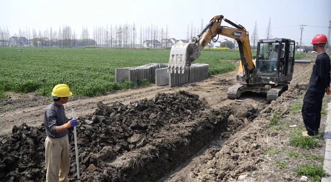 四月初,枫泾镇五一村的高标准农田建设项目进入收官阶段。经过土地整合,挖掘机正沿田边开挖沟渠,铺设水泥U型槽。
