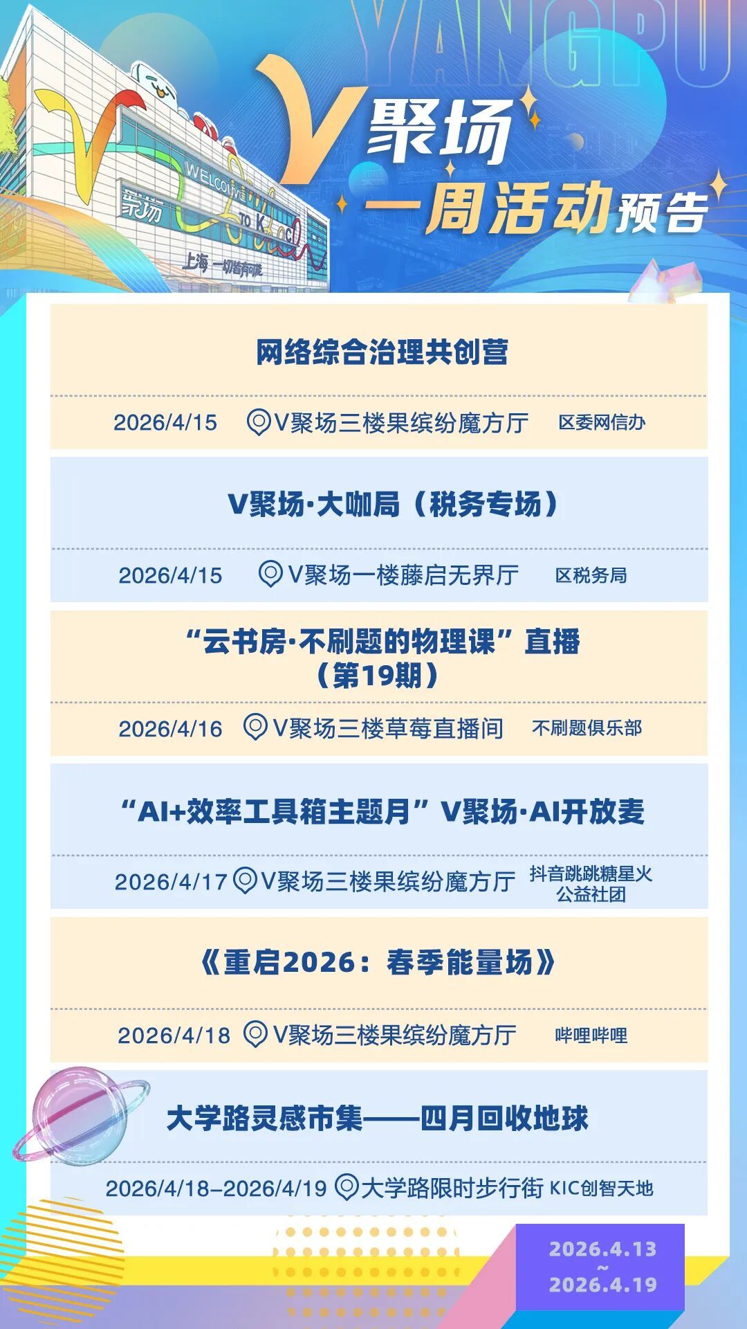 与千万粉丝“UP主”面对面互动,和B站、抖音、小红书等互联网大厂座谈交流,与AI领域创始人探讨人工智能发展新趋势……在杨浦V聚场,随时都有最前沿活动等你来打卡。无论你是互联网从业者,还是创意玩家……这里都将成为你迸发灵感的“能量场”。V聚场4月13日-4月19日一周活动预告来啦!快来碰撞灵感~