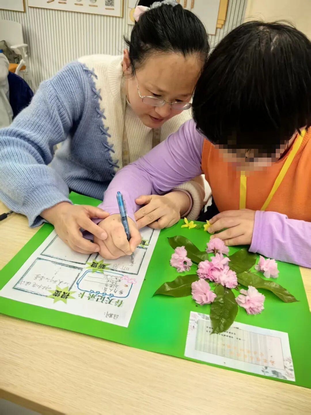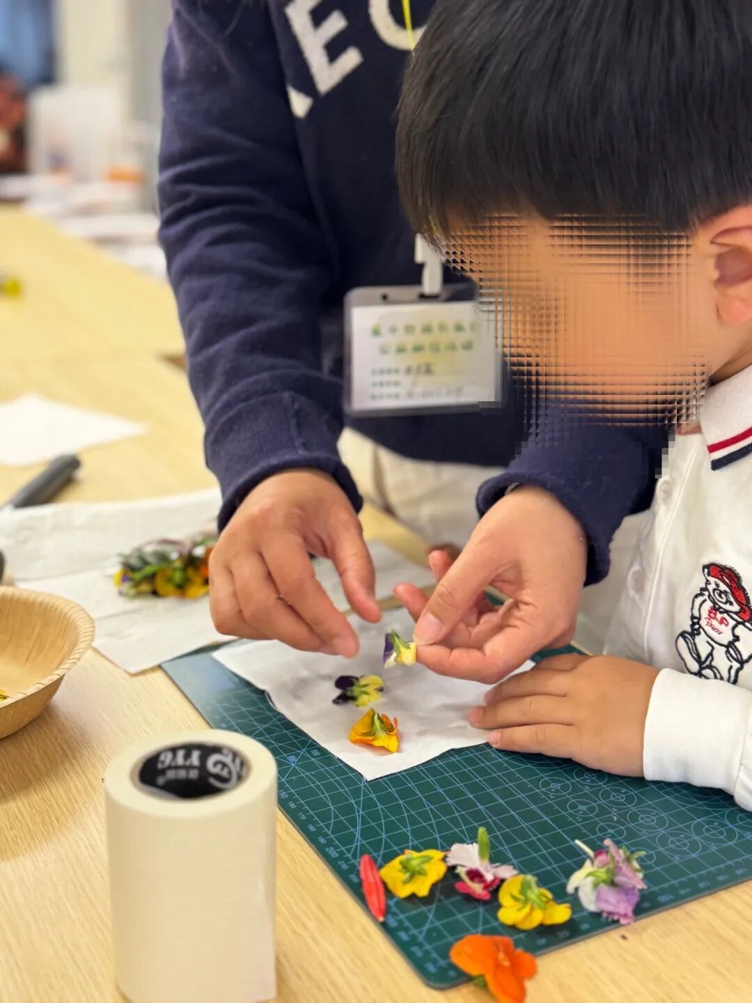活动现场暖意融融、欢声笑语不断。普通儿童与孤独症儿童一对一牵手结对,在精心设计的自然游戏与互动环节中亲密协作。有的孩子结伴完成植物日历制作,小手相握、眼神交流,在共同探索中打破隔阂;有的一同参与“两人三足”游戏,家长耐心引导孩子,并轻声鼓励,孤独症孩子也渐渐敞开心扉,露出纯真笑容。