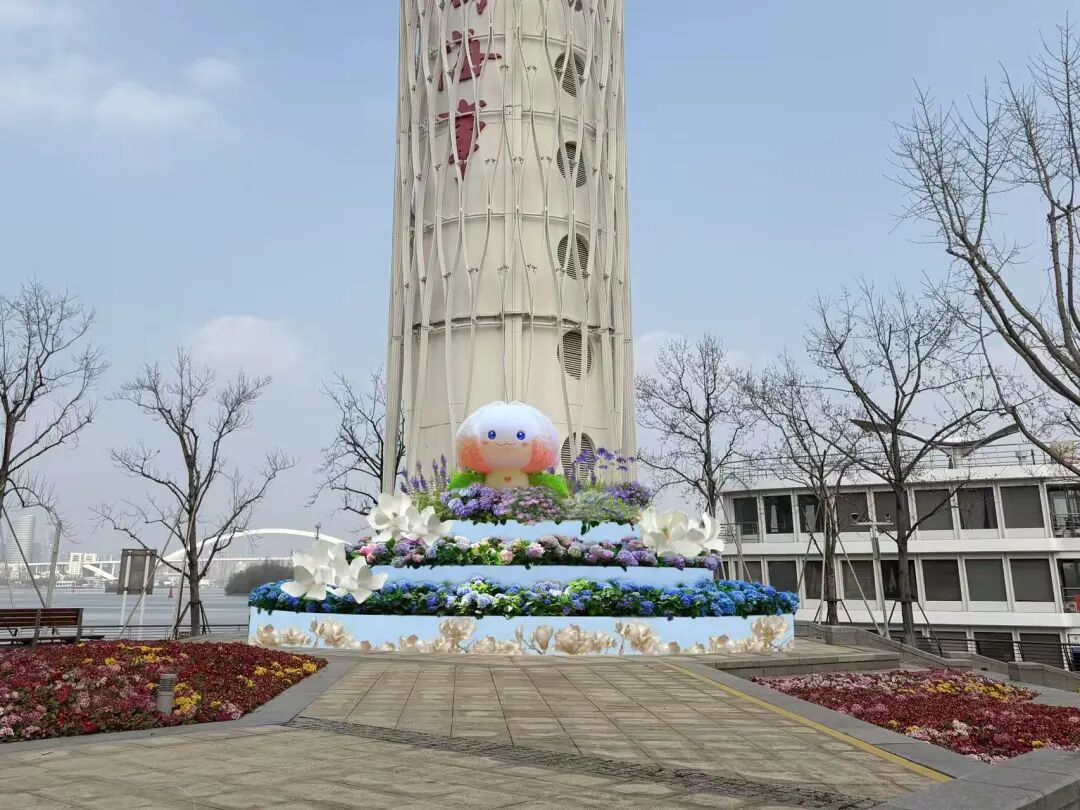 以“绣球蛋糕”为灵感,打造沉浸式花艺景观。围绕海事塔基座,蓝紫与粉色系的绣球呈同心圆式层叠铺展,如奶油裱花般从塔身向江岸流淌。围边镶嵌白玉兰图案,四周点缀白玉兰艺术装置,整体融合海派文化与现代花卉艺术,将硬朗的工业遗存化为柔美的“发光蛋糕”,形成“塔—屿—花”立体生态美学空间,既彰显“花开新时代”的节庆主题,又通过动态光影,展现科技与自然和谐共生的未来花艺魅力。让市民在繁花与光影中,感受西岸从“工业锈带”到“生活秀带”的诗意转身。