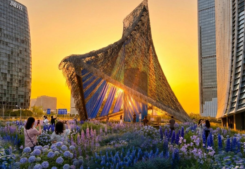 当夕阳穿透渐变的蓝色布幔,光影在随风摇曳的花海中流转,这座“蓝巢”不仅是自然与建筑的对话,更是都市人在此驻足、休憩、感受生命律动的精神栖息地。