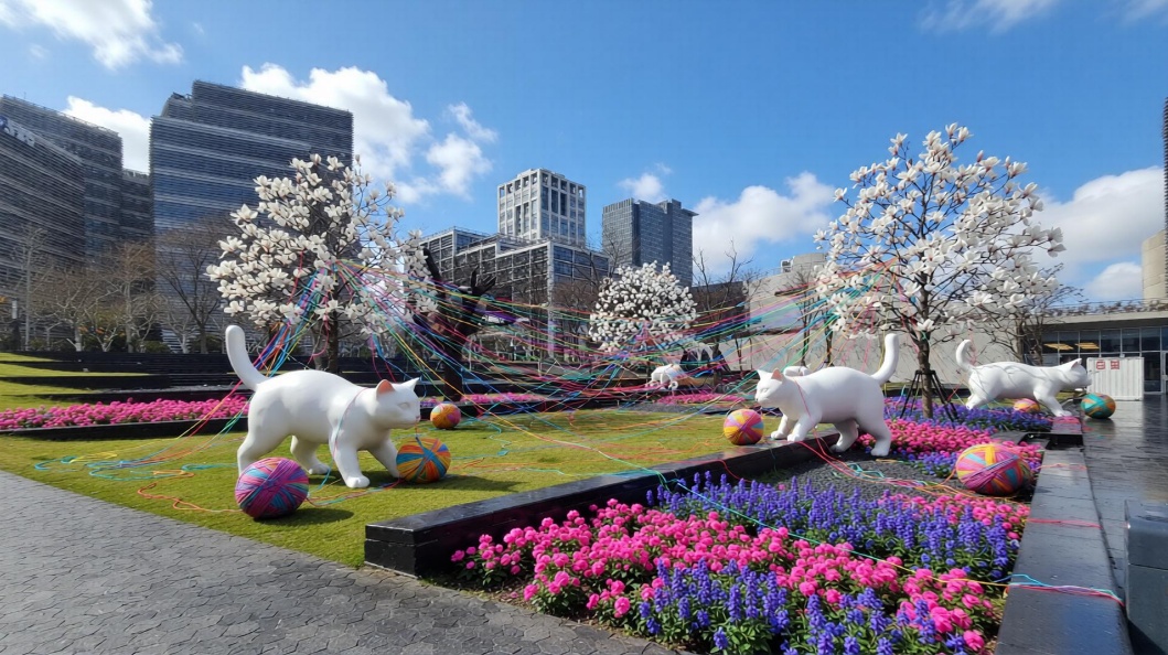 “玩个毛线”艺术装置,灵感源于活力象征——猫咪!在绿地中,设计师将彩色毛线团散布拉扯在花丛和树之间成为猫咪的玩具,白色的猫咪雕塑仿佛下一秒就要跃动。这片装置位于上海油罐艺术中心入口绿地,承载着美好与梦想的编织,引领着每一个前来参观花展的人。