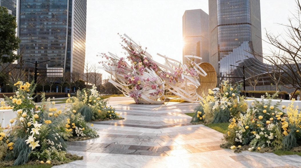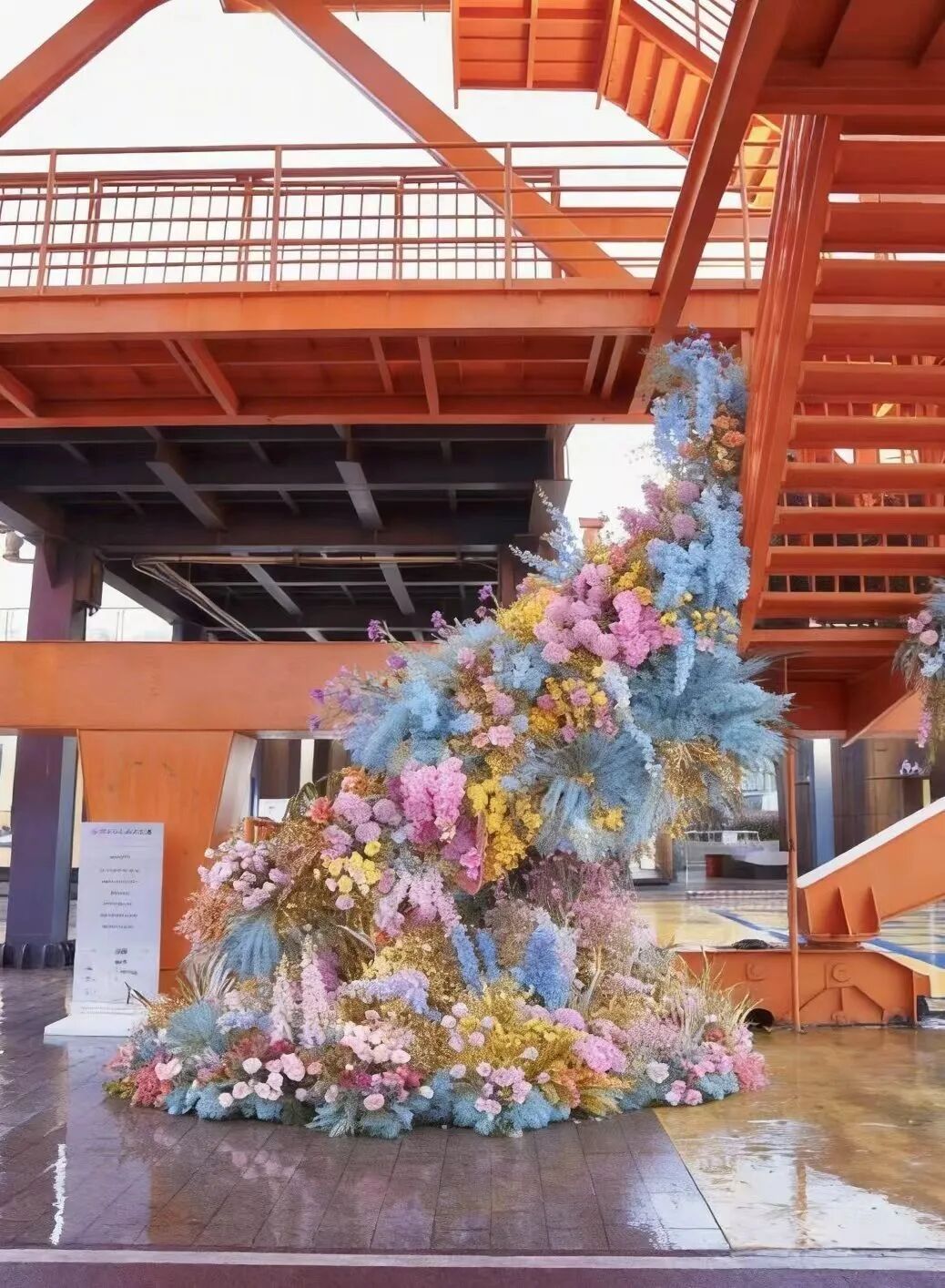 “向野而生”以橙红钢铁塔吊为骨,马卡龙色系永生花和鲜花为脉,让柔美的自然生机在硬朗的城市工业空间中肆意生长。它打破钢筋水泥的边界,绽放出不受束缚的自然野趣,在滨江岸线之上,演绎都市中生命向上、向野而生的力量。