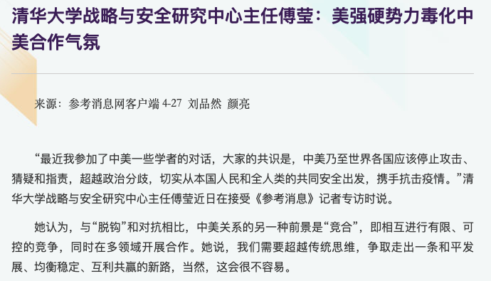 今年4月,傅莹接受了《参考消息》的采访,在采访中傅莹直陈,现在中国正在向世界多国提供支持,大部分合作顺利有效,但坦率地说,与美国的合作并不理想,原本可以更好。