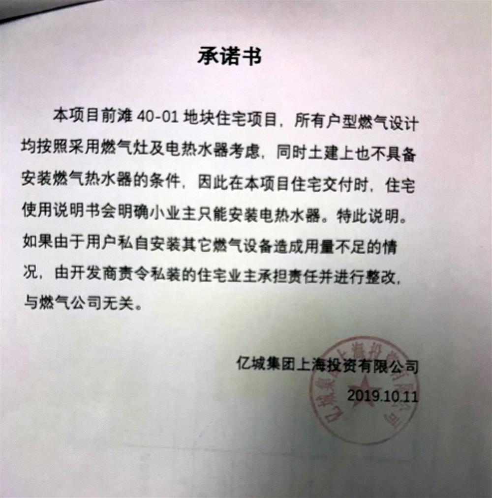 △图为去年10月11日开发商给燃气公司出具的一份《承诺书》,承诺每户业主只使用一台家用燃气灶,不使用燃气热水器。《承诺书》中写有“若有用量不足的情况,与燃气公司无关”等字样。