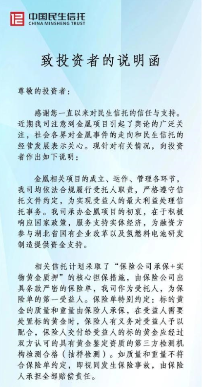 近期,民生信托、东莞信托等已致信投资者,对金凰珠宝假黄金案做出回应,称维护投资者权益,正通过法律途径要求保险公司履行对质押假黄金的保险责任。