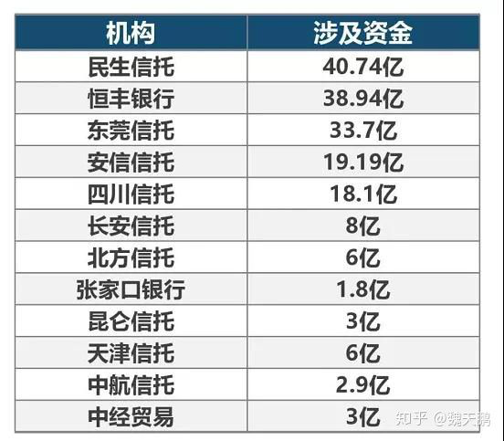 据初步统计,目前涉及的金融机构达15家,未兑付的融资160亿,包括民生信托40.74亿元、恒丰银行38.94亿元、东莞信托33.7亿元、安信信托19.19亿元、四川信托18.1亿元。此外,多家银行和小额贷款公司也被卷入。
