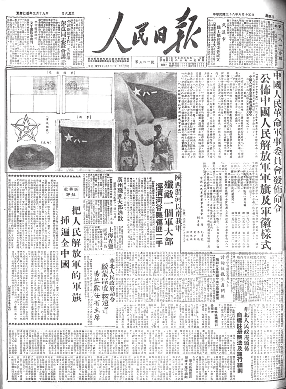 1949年6月15日开幕的新政协筹备会议上,以中国人民革命军事委员会主席毛泽东,副主席朱德、刘少奇、周恩来、彭德怀的名义,正式发布了《公布中国人民解放军军旗军徽样式》的命令,当天,人民日报发表了题为《把人民解放军的军旗插遍全中国》的社论中说: “人们看到人民解放军的军旗和军徽,就会想到它所走过的曲折的道路,想到人民革命力量必然获得最后胜利的真理。”从此,中国人民解放军有了自己统一的军旗。