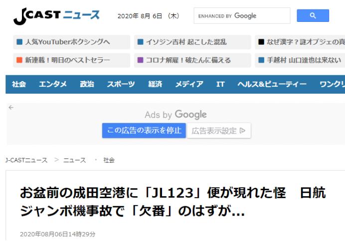 “j-cast”新闻网:成田机场惊现“ JL123”航班,日航却称系“航班号设定错误”