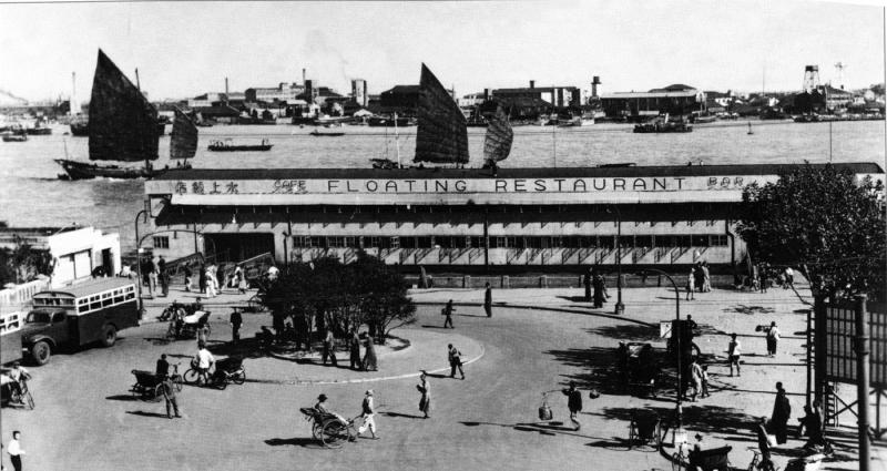 再说说曾为昔日海上一景的北京路轮渡站吧。那是一座钢质双层浮码头,底层专供乘客候船及上下客使用,二层用作站务办公。您一定会纳闷,在人来人往的水上客运枢纽,景从何来?其实,这与一家名为“水上饭店”的食肆休戚相关。1935年3月,水上饭店在北京路轮渡码头二楼开门迎客。老板陈生昇是个精明的生意人,深谙选择市口的门道,不惜重金租下这块风水宝地,还附庸风雅地给自家餐馆起了个英文名字,唤作“Floating Restaurant”(意即“浮动的餐厅”)。
