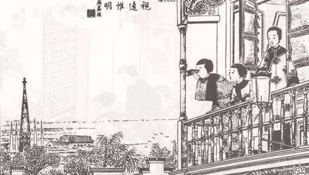 清《三姑嬉弈图》,左边是黄浦江,右边是上海城墙,建在城墙上的楼就是天后宫的丹凤楼,原图藏上海市历史博物馆。