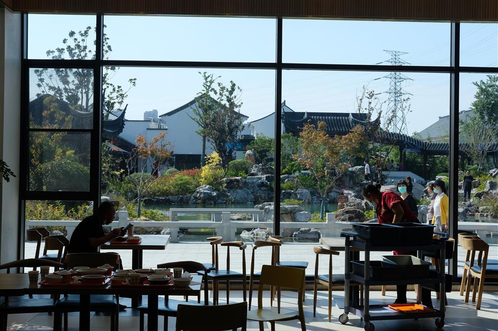阳澄湖服务区的许多细节确实令人耳目一新。建筑造型中有飞檐、粉墙和黛瓦;循着园林式的圆洞门走进去,穿堂而过就到了实体山水园林;亭台水榭有着最具苏州特色的“一街(观前街)三园(狮子林、拙政园、留园)”元素。此外,阳澄湖服务区引进了32种不同的业态,名创优品、绝味鸭脖、肯德基、猫屎咖啡……服务区非餐饮类业态占比已超过70%。在非遗文化艺术中心,苏绣、宋锦、核雕陈列其中。日本、菲律宾等多个国家和地区的业内人士,都去阳澄湖服务区取经。