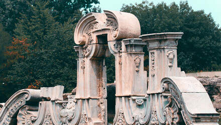 老照片比铜版画要准确,从学建筑的人眼睛里可以看出建筑比例各方面的关系,能够知道当年大概的样子。我们还发现了照片摄影师在他日记里有这么一段话:“这里的装潢……五彩缤纷,如彩虹般绚烂……映入你眼中的是装饰物丰富而动人的色彩,浸润在北京湛蓝色的天空里。随着观者移动的脚步和太阳的光影不停变幻,建筑物白色大理石的映衬让它们格外醒目,倒映在前方的湖面上,如同幻影……观者不禁怀疑自己来到了‘一千零一夜’的世界里。”摄影师怎么会有这样的结论?在遗址现场仍保有遗物,但是找不到相关线索,于是我们和圆明园管理处商量,进库房看看。在库房里,我们发现有一些琉璃瓦,过去也有先辈的研究说这几个房子都是琉璃瓦,而且琉璃瓦的颜色有蓝的、黄的。我们就比较了一下外国巴洛克时期的一些房子,它们的色彩基本用在屋顶上,比如柏林夏洛腾堡宫和维也纳美泉宫,二者屋顶颜色不同,但是墙基本是同一色。可是这两座宫殿给大家的印象绝不是五颜六色。为什么摄影师说谐奇趣是“五彩缤纷,如彩虹般绚烂”呢?后来我们在圆明园库房里找到了一些琉璃构件残片,带有中式花纹或西洋花纹。结果发现老照片上有些花纹线脚跟这个对上了,比如有的可以作为女儿墙的栏杆,有的是腰线的线角,还有墙上镶嵌的花纹装饰。由此发现,感觉老照片上的琉璃块都可以对号入座贴上去。这些老照片所反映的色彩,给了我们一个启示,它不是一个纯粹的一般的西洋建筑,而是用很多彩色琉璃来装饰的,当时郎世宁这些传教士虽然按一般的巴罗克式建筑风格做了设计,但是也在琢磨如何让中国人接受巴洛克,在这个过程中,他们可能就想到把有特点的中国元素加进去。像这种例子我在其他地方也看到过,比如有的在教堂装饰里设计了中国的牡丹花、垂莲柱,但是我没想到谐奇趣贴了这么多琉璃,让建筑显得更加生动活泼。