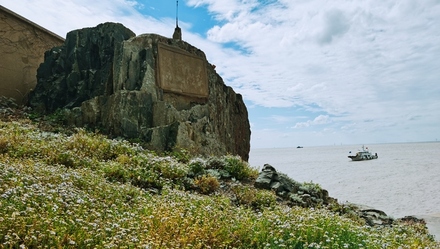 船在海上已经航行了1个半小时,远远地,一座小岛出现在视野里。它从一个小点逐渐变大,轮廓也慢慢清晰:小岛底部的一圈是灰黄色的岩石,因为地质活动和海蚀、海积作用,形成了一些石柱节理,突兀峥嵘。岩石以上是座小山,草木掩映、郁郁葱葱。在岛的最高处,一座白色的灯塔伫立在山巅。