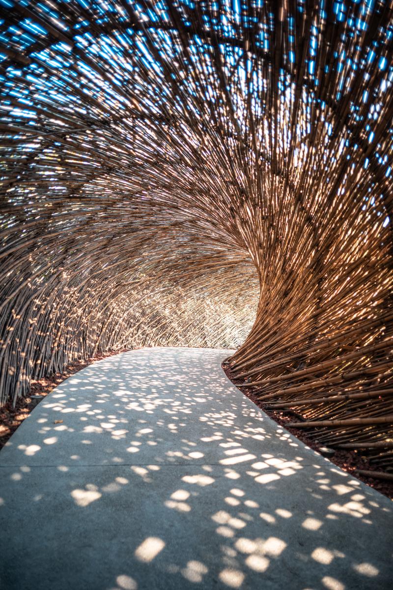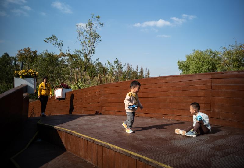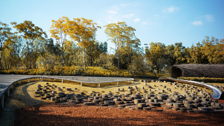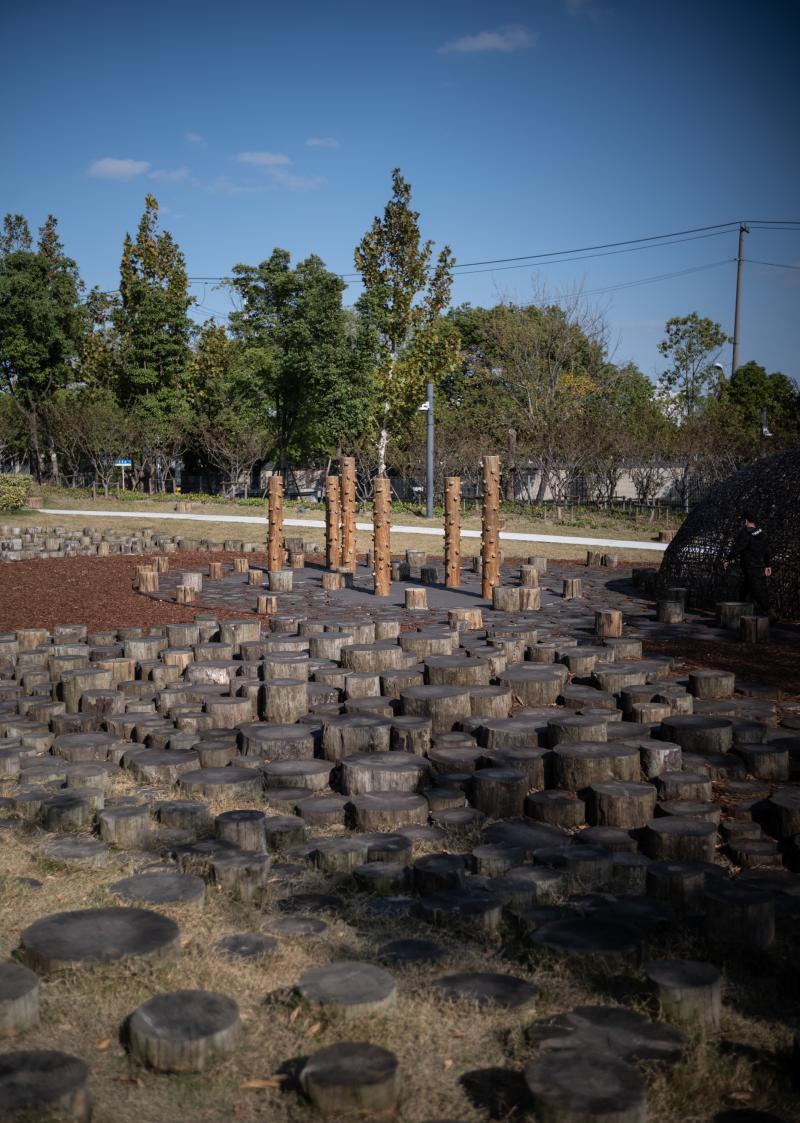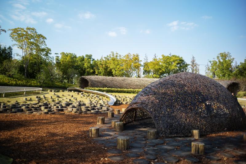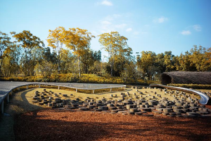 中央绿地最可圈可点的,是设计师精心打造的儿童乐园。不同于一般的公园,中央绿地的儿童公园在视觉风格上没有刻意地对区域进行低幼化的设计,而是通过各种充满自然野趣,设计感很强的游乐设施,让这里成了对成人、儿童都十分友好的游玩空间。这些设施颇有些“原始部落”的既视感,似有着回到人类童年时代的暗喻。