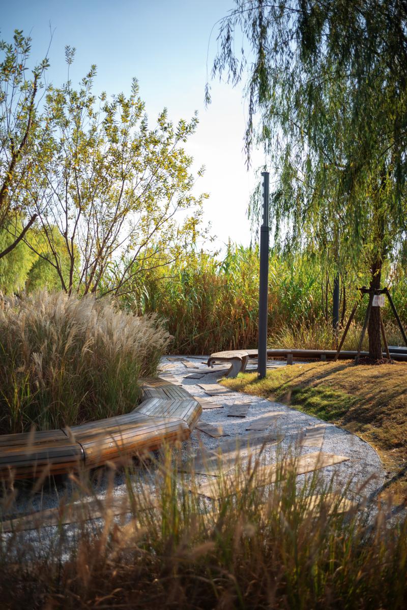 在桃浦中央绿地,随处可见设计精巧,线条粗犷的座椅,与绿植景观带的设计融为一体。