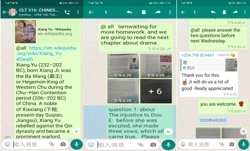 内罗毕大学孔子学院中方院长肖珊说,为保证疫情期间“停课不停学”,内大孔院根据学员具体情况制定教学方案。一般情况下,老师主要通过视频会议软件Zoom等平台在线授课;针对家里经常停电断网的学生,老师会在即时聊天软件Whatsapp群里分享学习视频与资料,方便学生离线学习。